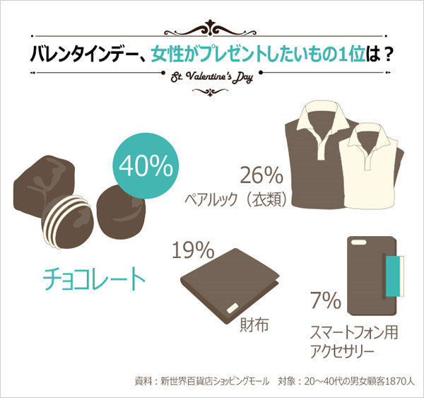 女性がバレンタインデーにプレゼントしたいもの1位は何といってもチョコレート(40%)。続いてペアルック(26%)、財布(19%)、スマートフォン(多機能携帯電話端末)用アクセサリー(7%)の順だった。