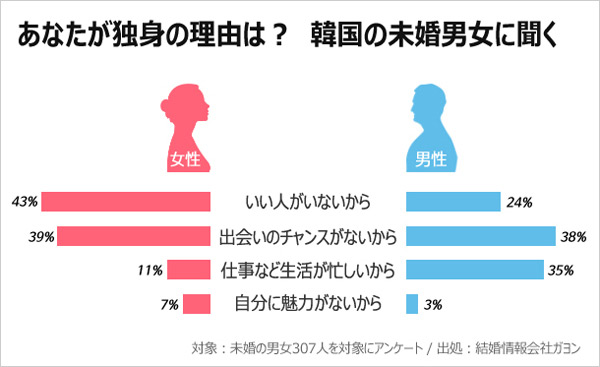 韓国の未婚男女は、自分が独身でいる理由についてどう考えているのだろうか。理想が高いから、自分に魅力がないから、出会いのチャンスがないから…。独身生活から脱出したいと思うのはいつか。各調査の結果を見てみよう。