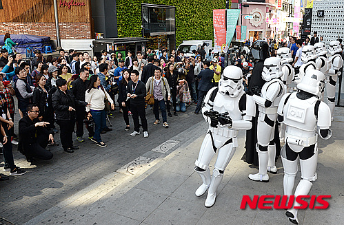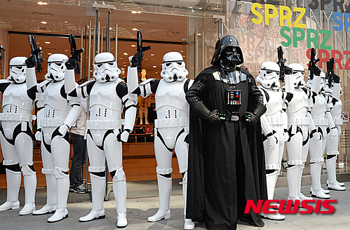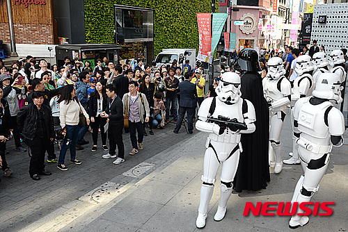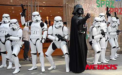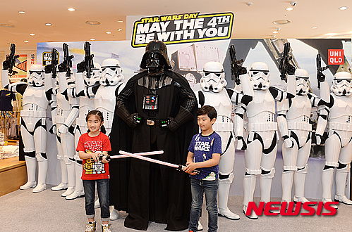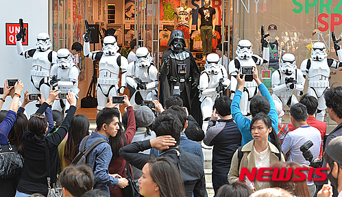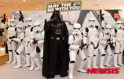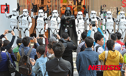 ソウル市中区の「ユニクロ」明洞中央店で4日午前、「スターウォーズデー」イベントが開催され、ダース・ベイダーとストームトルーパーが明洞に出現、市民や観光客らが写真撮影を行った。