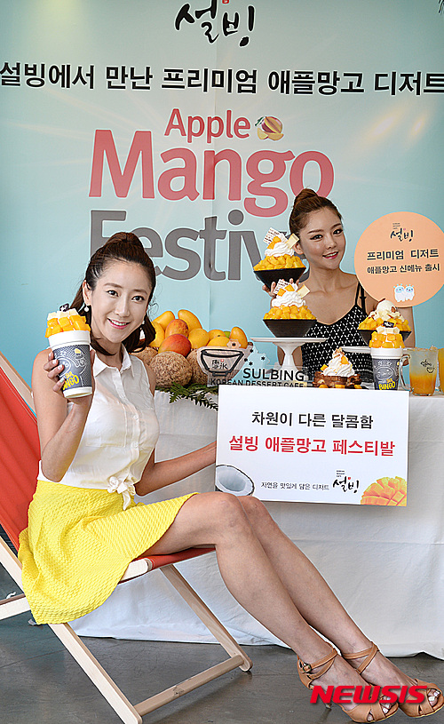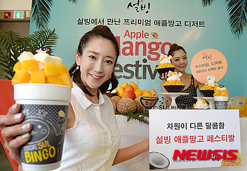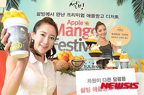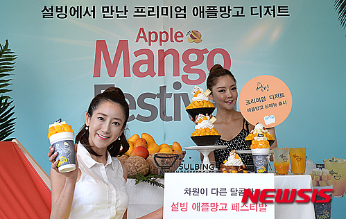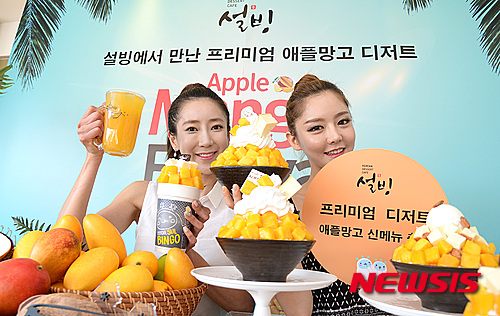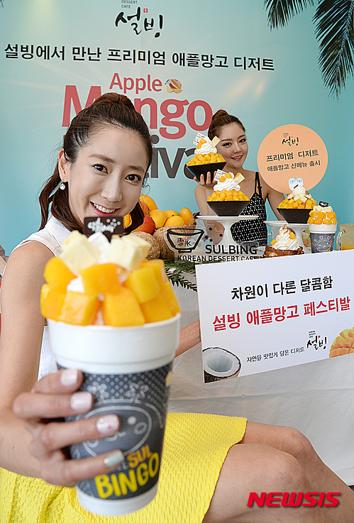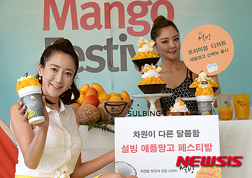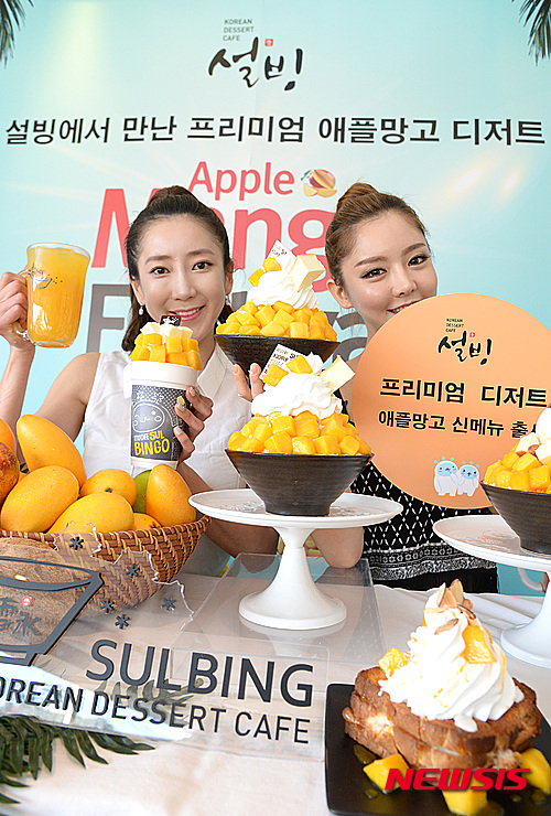ソウル市鍾路区のコリアン・デザート・カフェ「ソルビン」鐘閣店で5日、モデルたちがアップルマンゴーでつくった新商品をPRした。