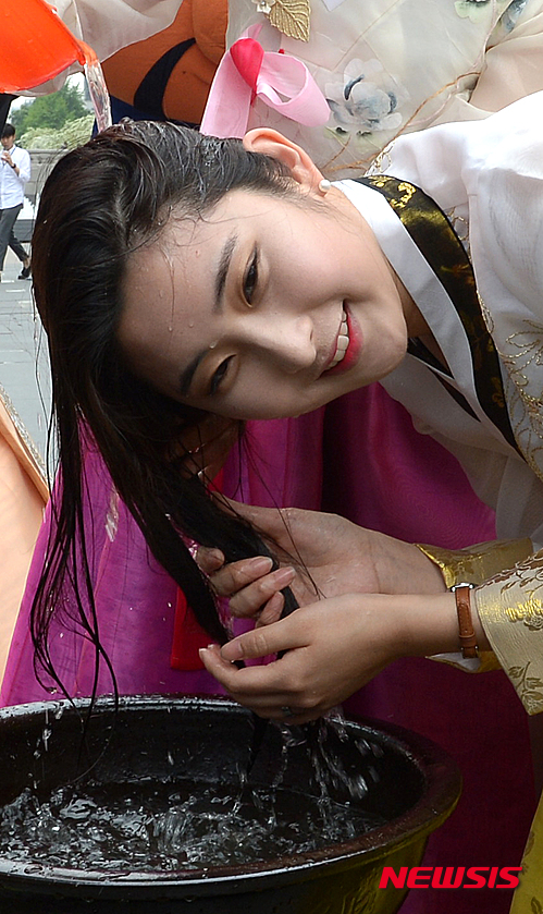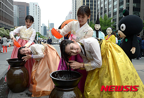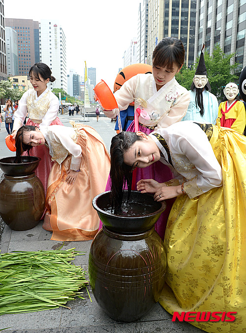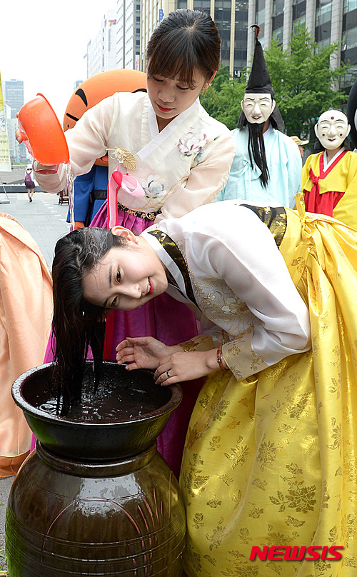 江陵端午祭が国連教育科学文化機関(ユネスコ)の無形文化遺産に登録されてから10周年を迎えるに当たり、ソウル市内の清渓川広場で11日午後、江陵端午祭委員会の関係者たちが広報活動の一環として、ショウブ水で髪を洗ってみせた。韓国では、端午の節句にショウブ水で髪を洗う習慣がある。