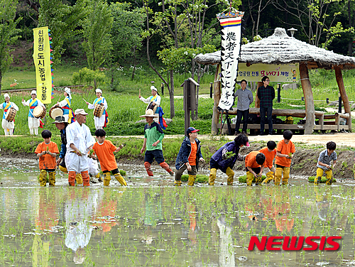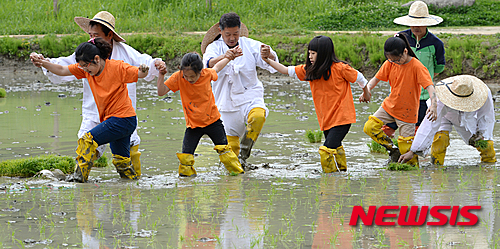 一字山都市農業公園(ソウル市江東区)内の水田で12日午前、子どもたちが田植え体験を行った。