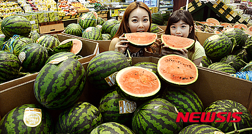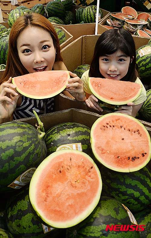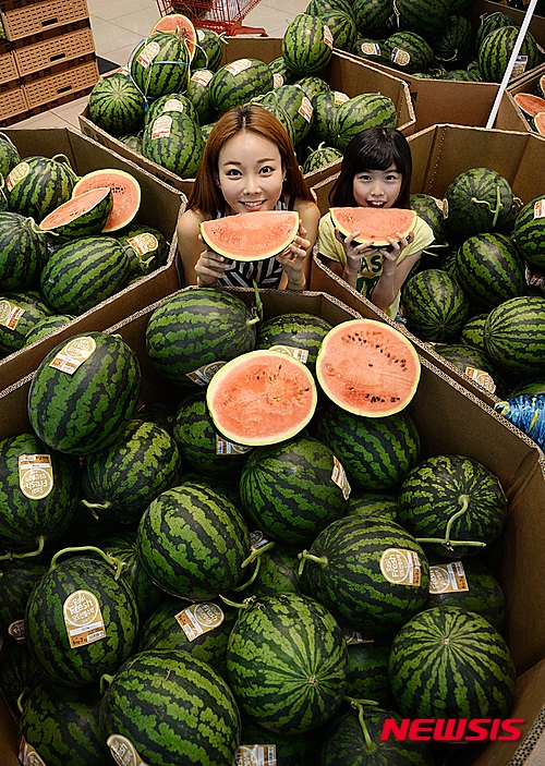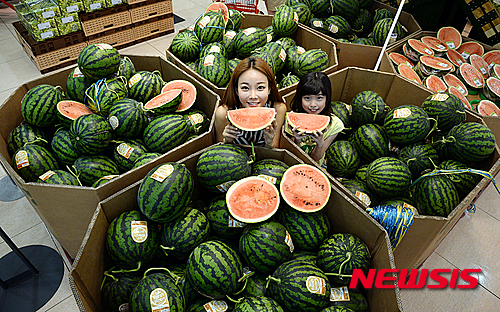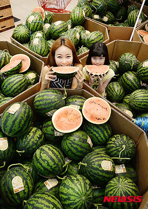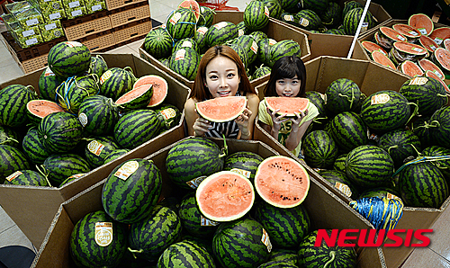 ソウル市中区の大手スーパー「ロッテマート」ソウル駅店で14日、モデルたちが、全数検査し選別された糖度11BrixほどのスイカをPRした。