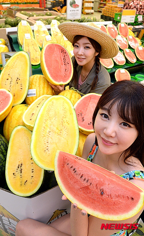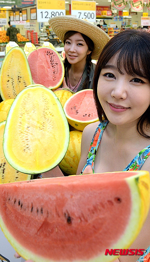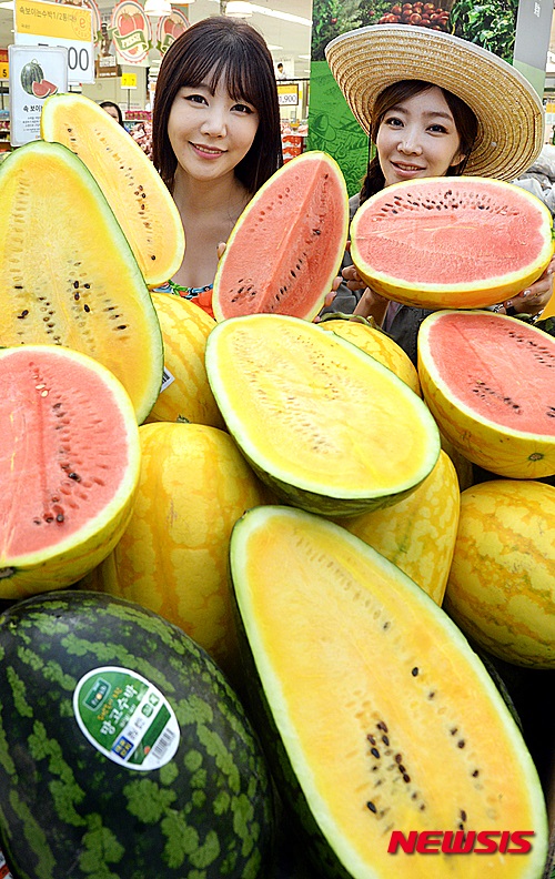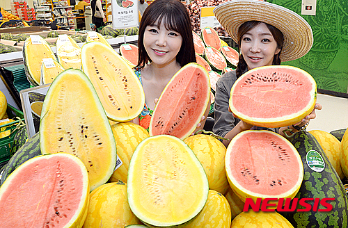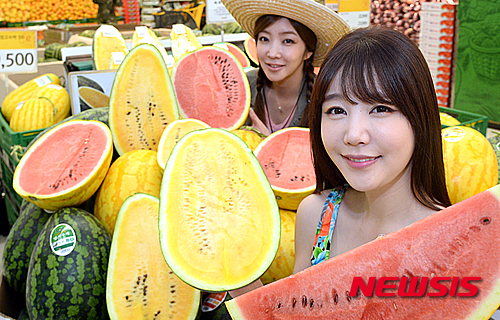 ソウル市内の大手スーパー「イーマート」竜山店で18日午前、慶尚南道咸安郡産の一風変わったスイカが店頭に並んだ。