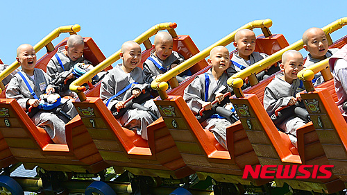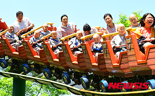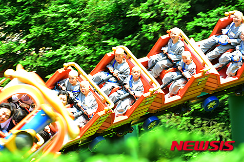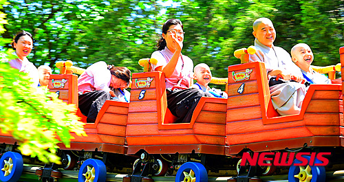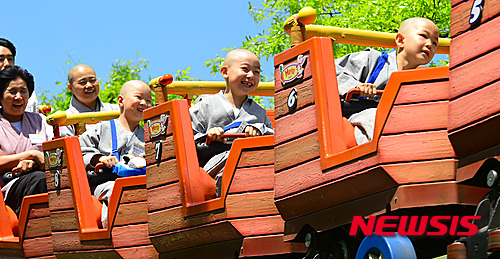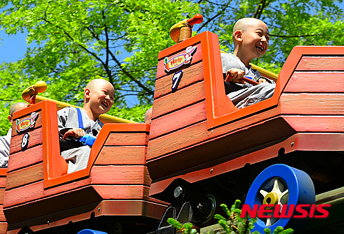 釈迦(しゃか)の誕生日(旧暦4月8日、今年は5月25日)を控え、短期出家した子ども僧たちが21日午前、京畿道竜仁市のエバーランドでアトラクションに乗るなどして楽しいひとときを過ごした。