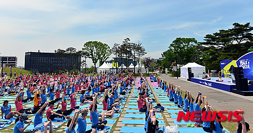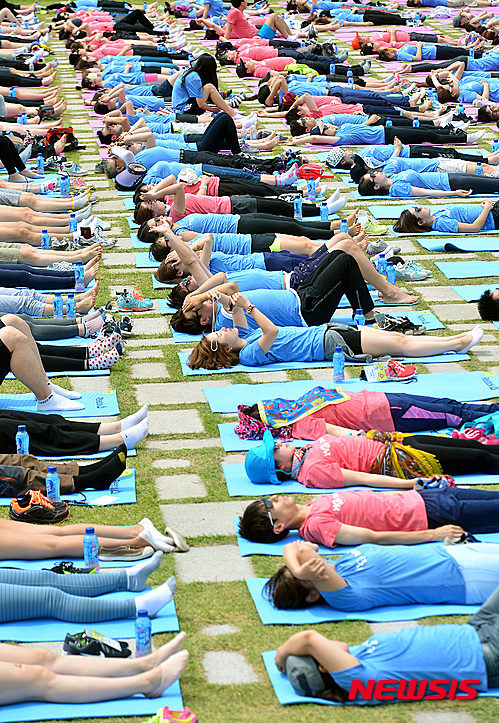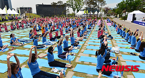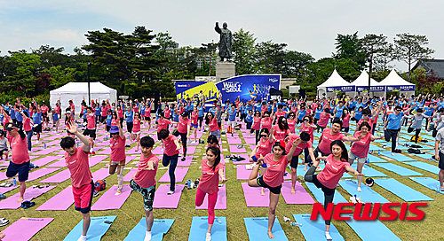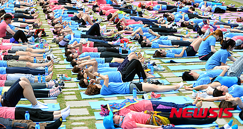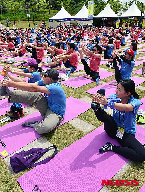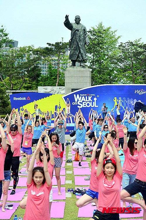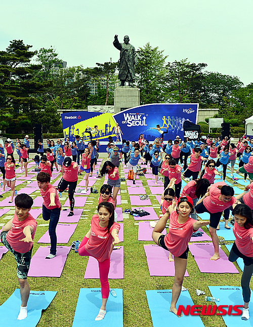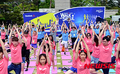 ソウル市中区の南山公園・白凡広場で5月31日午後、「Reebok」による南山ハイキング・イベント「ウォーク・オン・ソウル」が行われ、参加者たちが出発に先立ち、ストレッチング・ヨガを実施した。