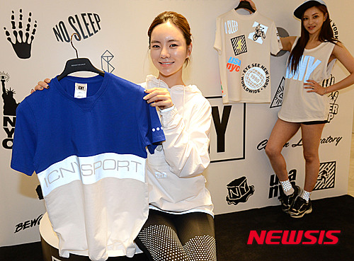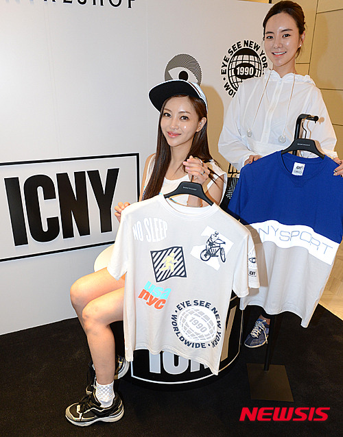 ソウル市中区の新世界デパート本店新館で5月31日午前、モデルたちが、ファッションブランド「ICNY」のTシャツをPRした。これらのTシャツは反射板素材が使われており、光が反射するため、夜でも安全だ。