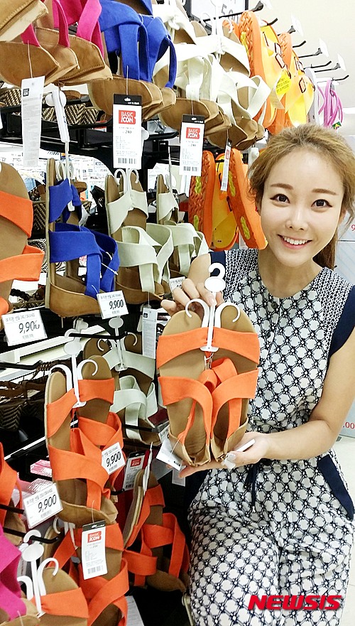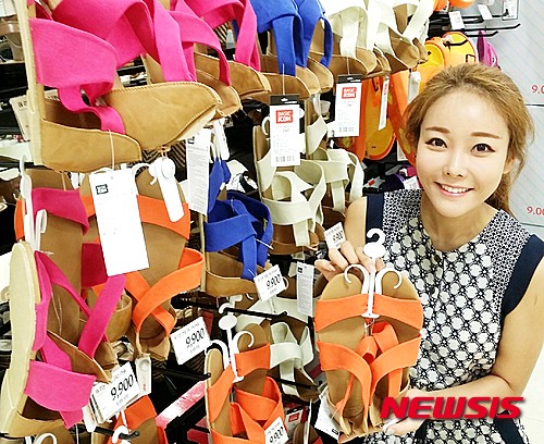 ソウル市中区の大手スーパー「ロッテマート」ソウル駅店で5日、モデルがカラフルなBIリボンサンダルを紹介した。