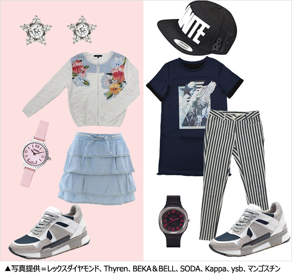 まず、運動靴ではつらつとした少女のような感性をアピールしたかったら、花柄がポイントのカーディガンやジップアップジャケット、デニムのフレアスカートを合わせてみよう。さらにキュートなイヤリングや時計でポイントを置けば、ウィットあふれるガーリッシュルックが完成する。