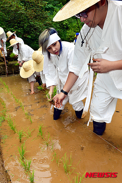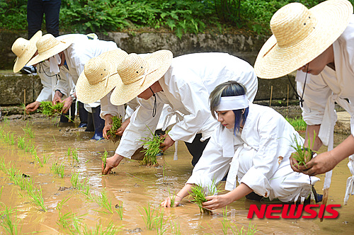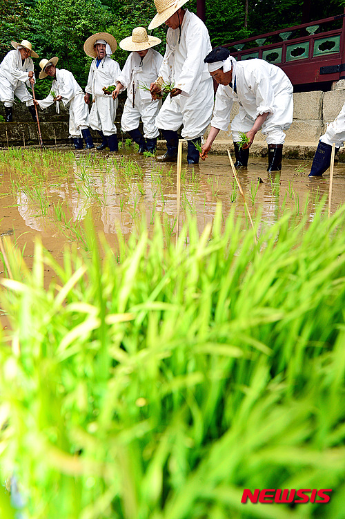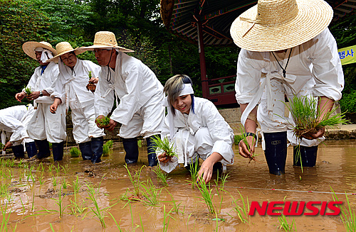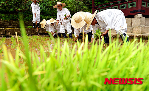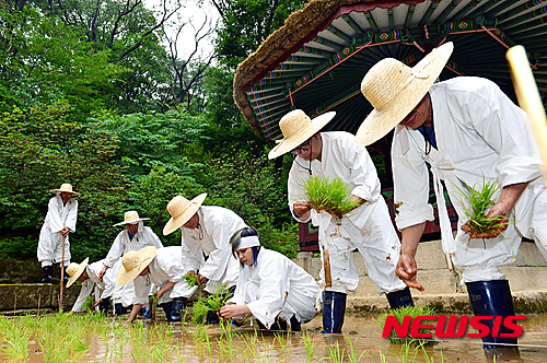 昌徳宮(ソウル市鍾路区)内を流れる玉流川近くのチョンイ亭で5日午前、文化財庁や農村振興庁の関係者、そして外国人観光客たちが田植え行事に臨んだ。