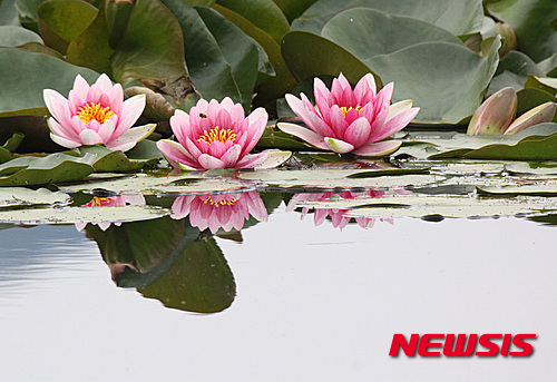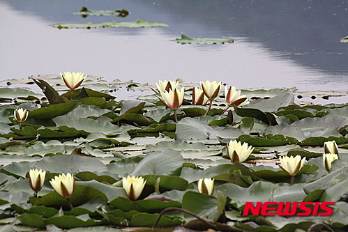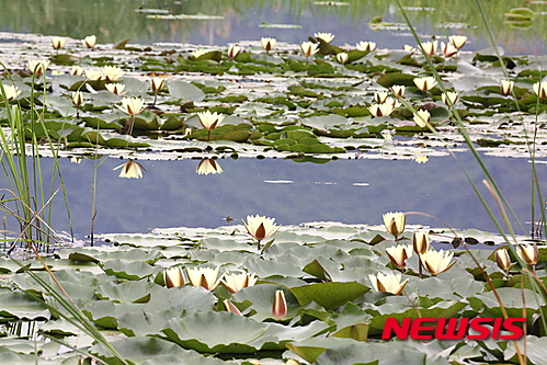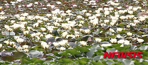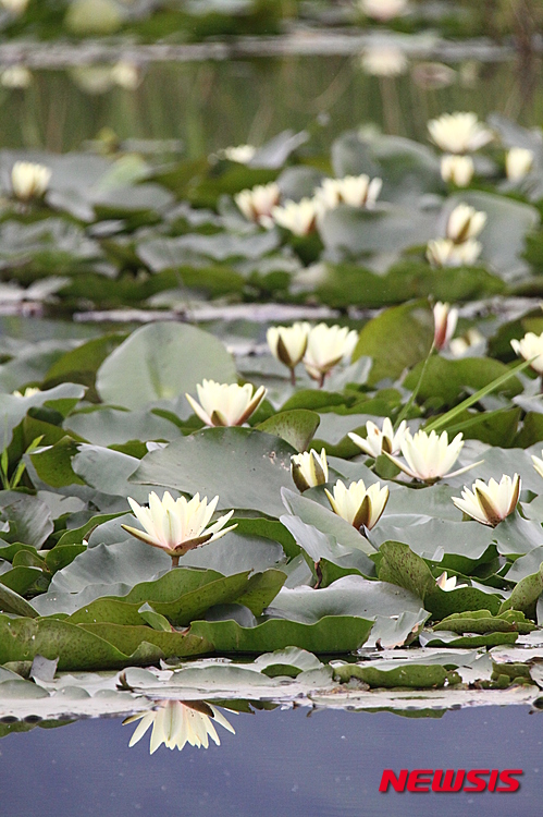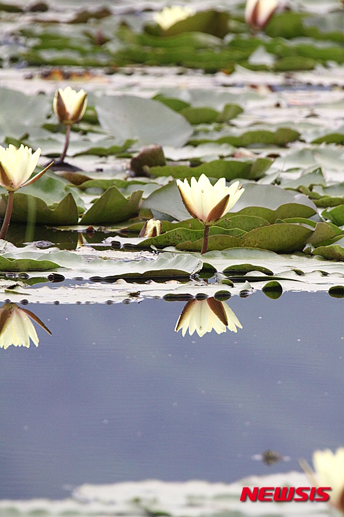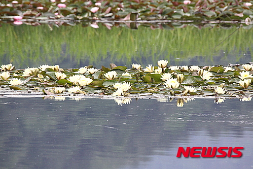 江原道華川郡の水生植物生態公園では12日午後、さまざまなハスの花が咲き、美しい景色が広がっていた。