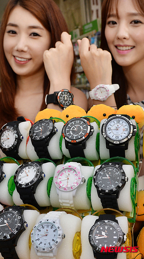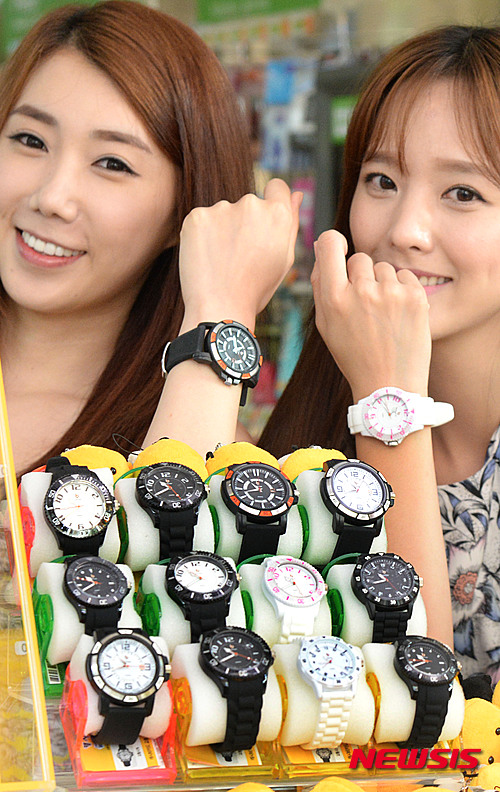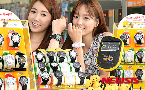 ソウル市中区のコンビニエンスストア「セブンイレブン」小公店で16日午前、モデルたちが、交通カードやショッピング時の決済、ポイントカード機能などを一つの腕時計に搭載した「キャッシュ・ビー・ウォッチ」を紹介した。