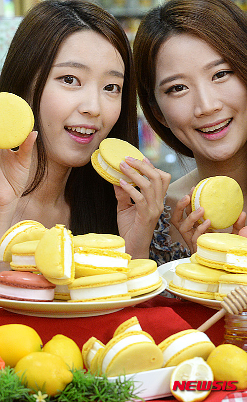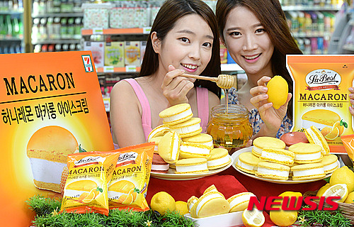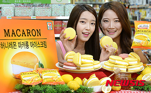 ソウル市中区のコンビニエンスストア「セブンイレブン」小公店で18日、モデルたちが新商品「ハニーレモン・マカロン・アイスクリーン」を紹介した。