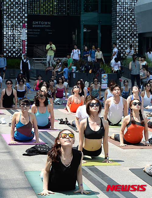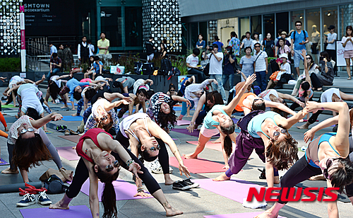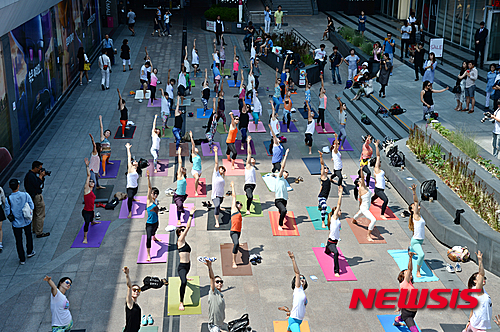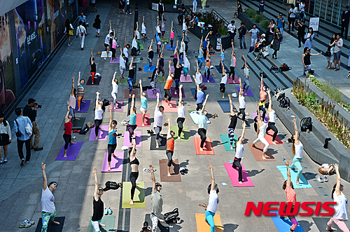「国際ヨガの日」に当たる21日午後、ソウル市江南区三成洞のCOEXミレニアム広場では、全国から集まったヨガ専門家たちがフラッシュモブ(不特定多数の人が特定の場所に集まり、同じ行動を取ること)を行った。