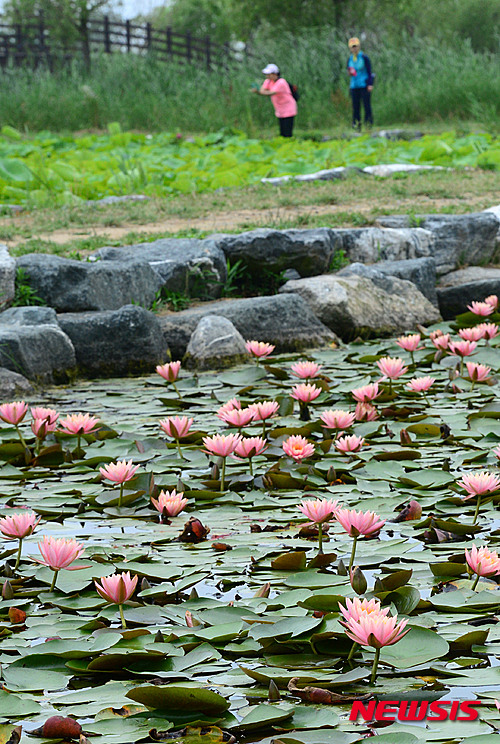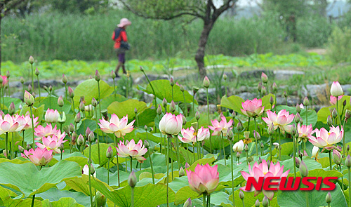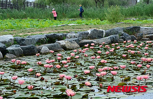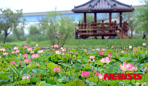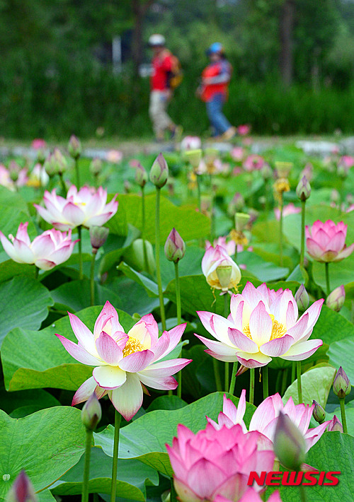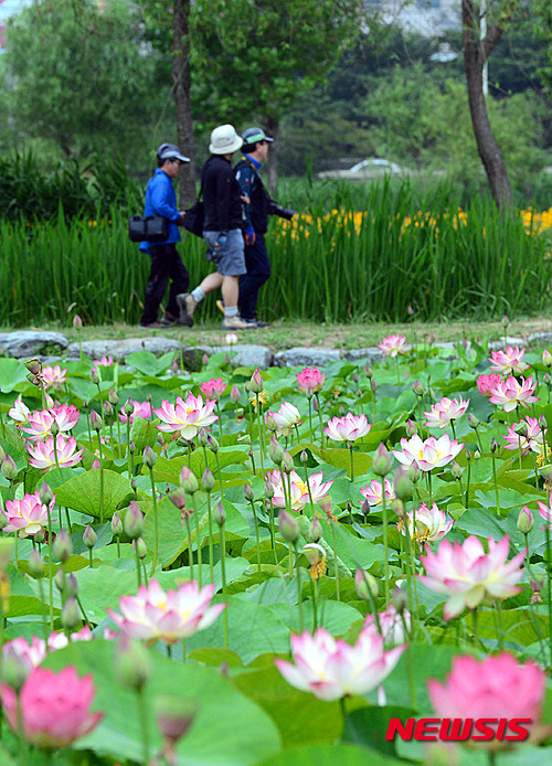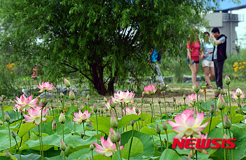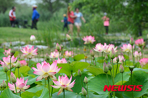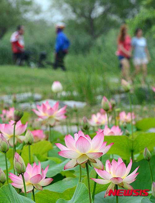釜山市沙上区の三楽生態公園では21日、訪れた市民たちが、咲き誇るハスの花を眺めながら楽しいひとときを過ごした。