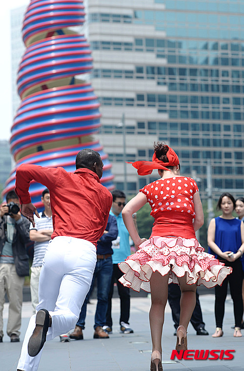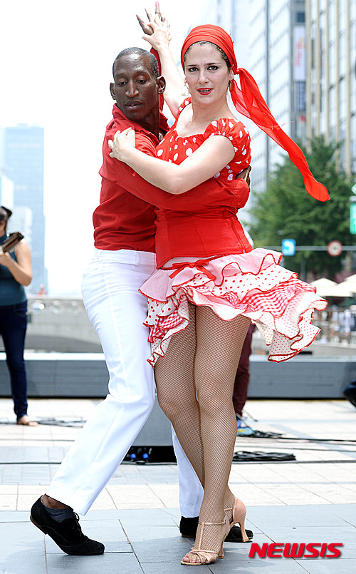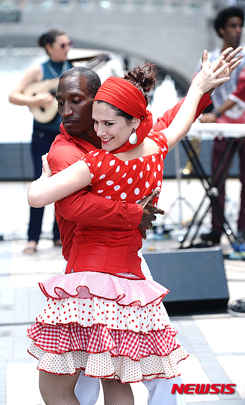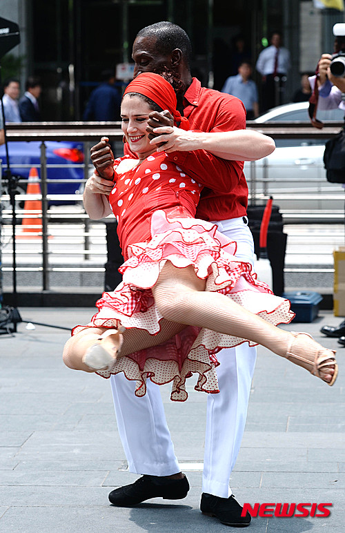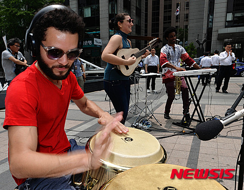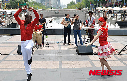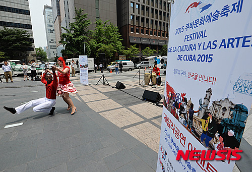 ソウル市内の清渓広場で24日午前、キューバのミュージシャンたちが、26日から開催される「キューバ文化芸術フェスティバル2015」をPRするため、ゲリラコンサートを行った。