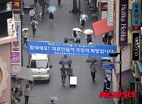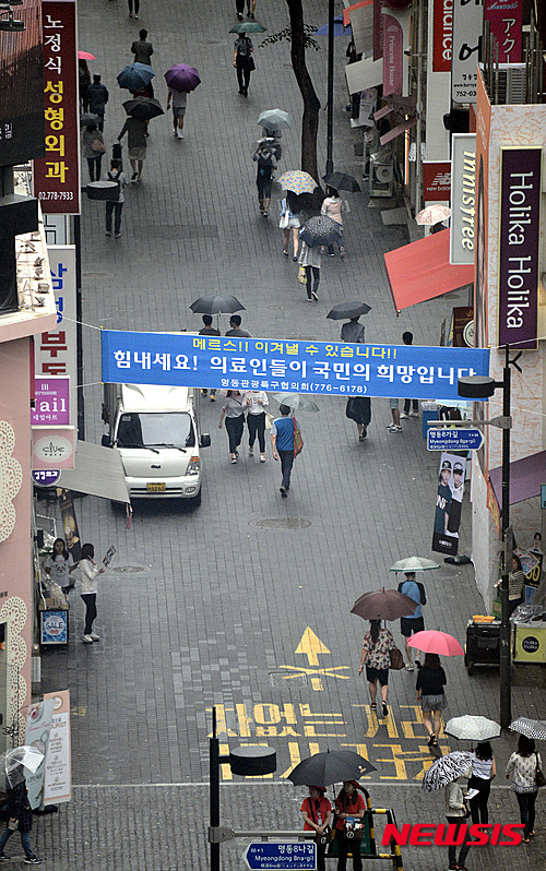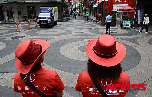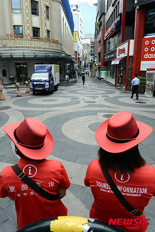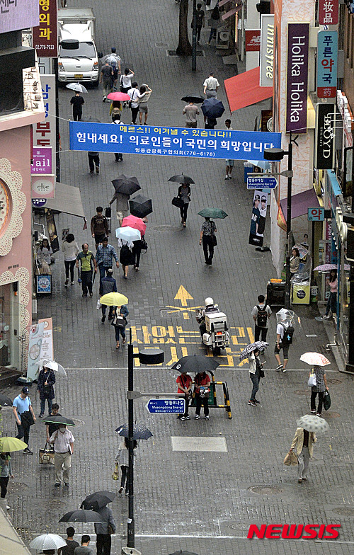 中東呼吸器症候群(MERS=マーズ)をめぐり4兆ウォン(約4416億円)の経済損失が予想され、政府が最低10兆ウォン(約1兆1040億円)の追加予算を編成することを決めた中、ソウル市中区明洞では26日午前、市民や観光客はまばらだった。
