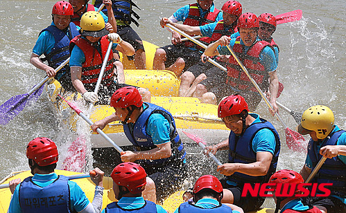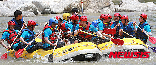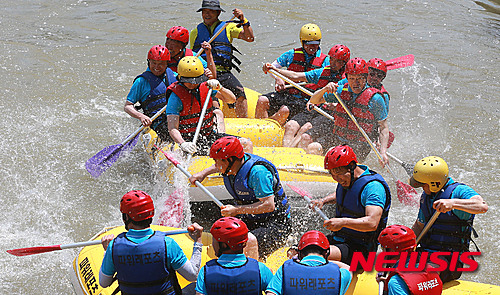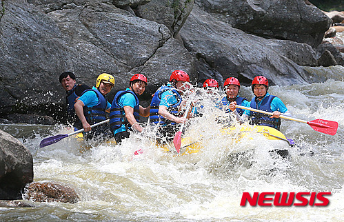 暑い日が続いている中、慶尚南道咸陽郡を流れる厳川江で28日、ラフティング愛好家たちがボートに乗って急流を下りながら、楽しいひとときを過ごしていた。