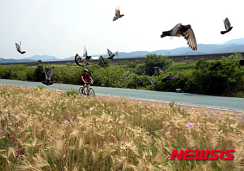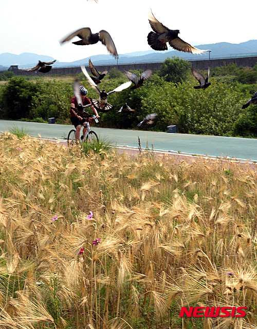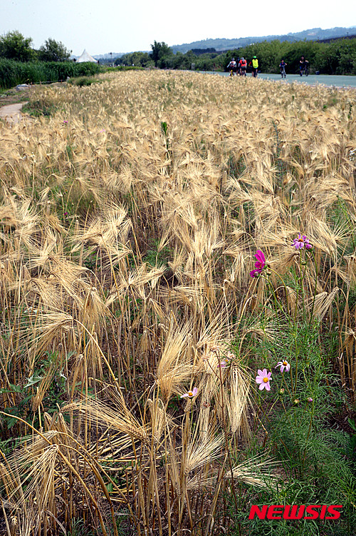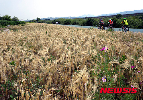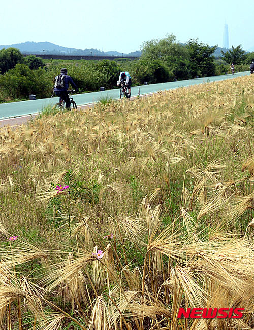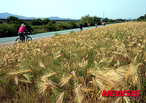 熱い一日となった28日午後、京畿道城南市を流れる炭川の河川敷では、黄金色に染まった麦畑を眺めながらサイクリングを楽しむ市民たちの姿が見られた。
