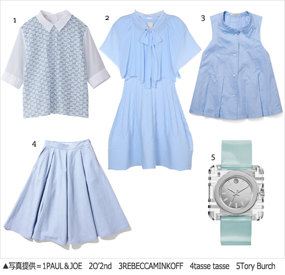 聞いただけでも、澄み切っていて美しい感じがするアクアブルーは、淡いブルー系カラー。これは、純粋で清涼感あふれる印象を与え、最近のように暑い夏にピッタリ。女性らしいスタイルの服からクラシカルなシャツ、アクセサリーに至るまで、さまざまななアイテムを楽しんでみよう。