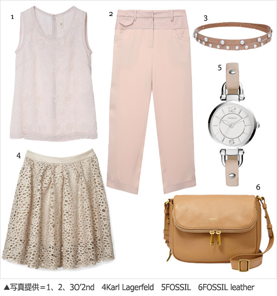 「トーステッド・アーモンド」でソフトな感性を生かしたかったら、ブラウスやスカートのようにフェミニンなアイテムや、革製アクセサリーに注目したい。