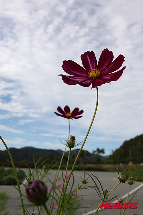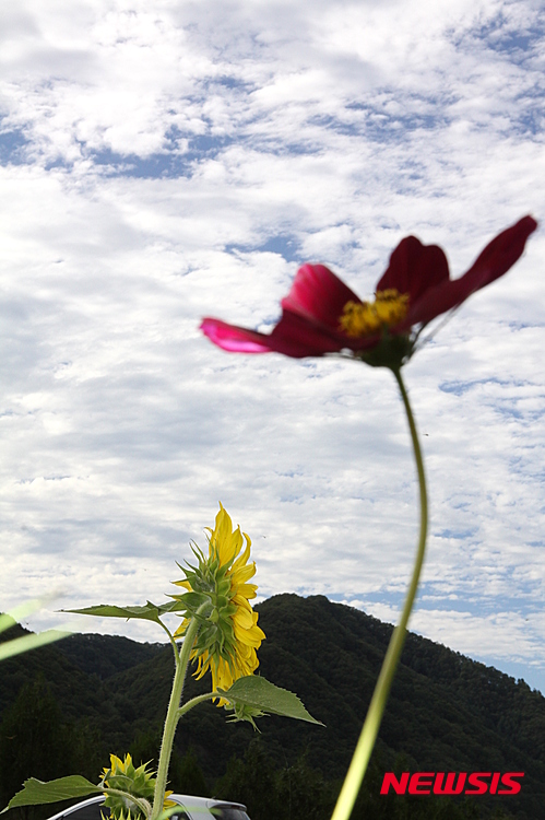 江原道華川郡の水辺公園では7日午後、早くもコスモスが咲き、訪れる人たちの目を楽しませていた。