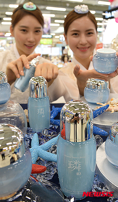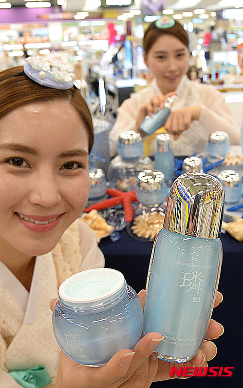 ソウル市内の大手スーパー「ホームプラス」江西店で8日、モデルたちが韓方(韓国式の漢方)化粧品「リン」を紹介した。