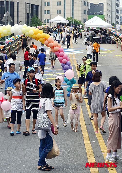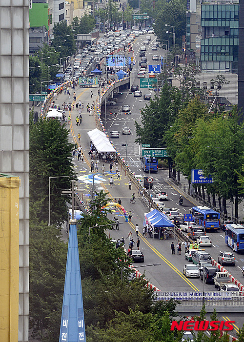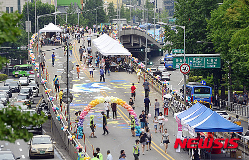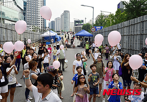 ソウル市内の西大門高架道路で11日午後、撤去記念イベントが行われ、市民たちが風船を飛ばすなどした。ソウル市は15日から撤去工事に取り掛かり、9月初めに開通すると発表した。