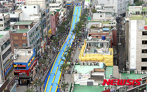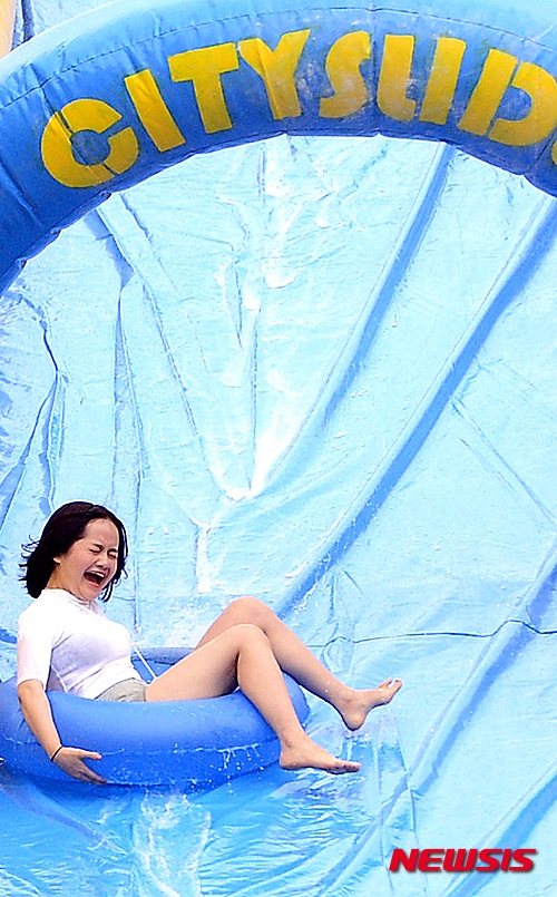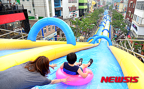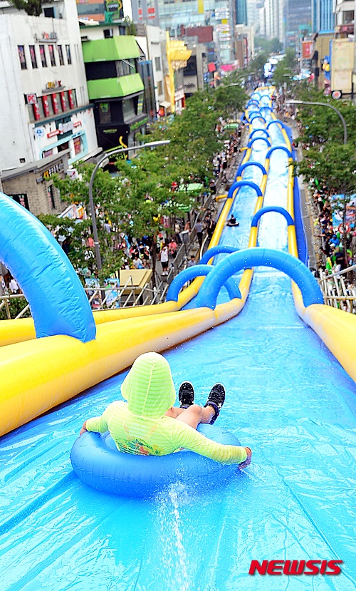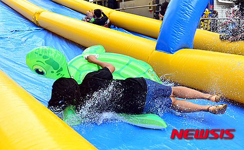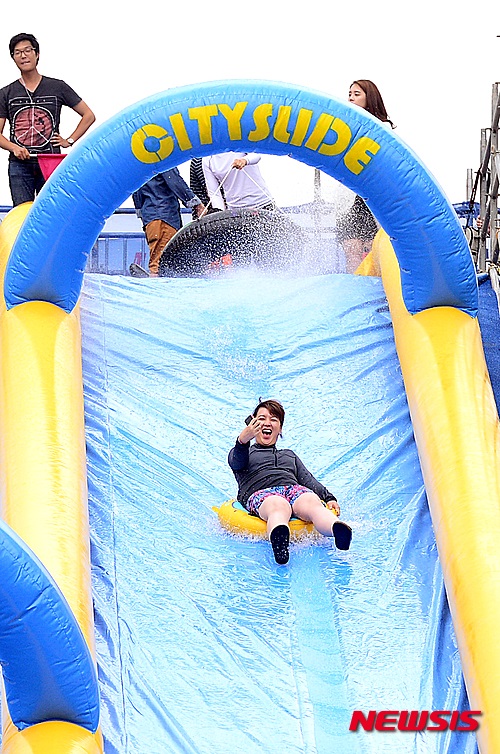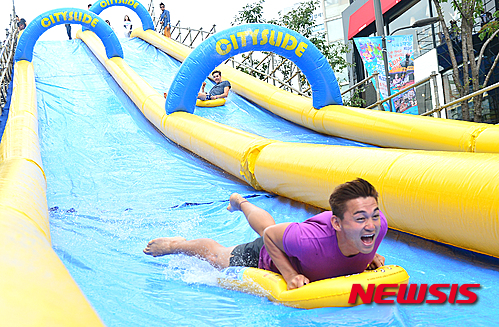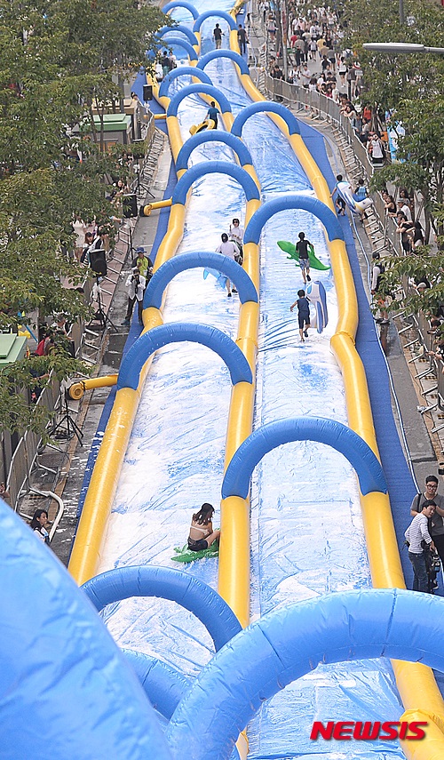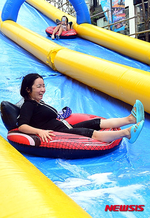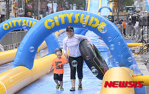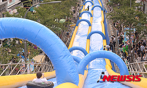 週末を迎えた18日午後、ソウル・新村の延世路で都心のウォーター・フェスティバル「シティ・スライド・フェスタ2015」が開催され、市民たちがウォータースライダーを滑りながら楽しいひとときを過ごした。
