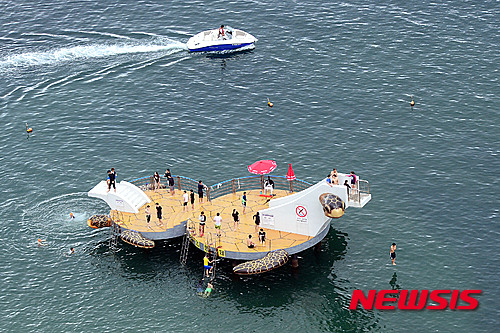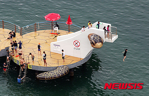釜山市西区の松島海水浴場で19日午後、行楽客たちがカメの形をした海上ダイビング台から海に飛び込み、楽しいひとときを過ごしていた。