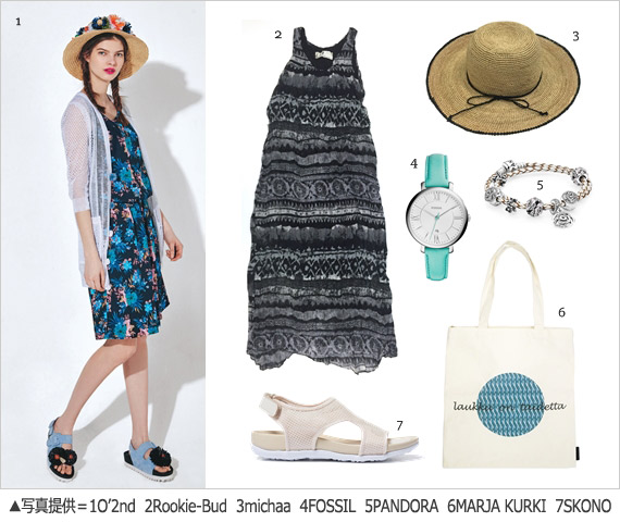 さらに、熱い日差しを避けるため帽子をかぶり、防水&通風機能を備えたサンダルを履き、ビビッドカラーの時計やブレスレットを身に着ければ、華やかなフェミニンルックの完成だ。
