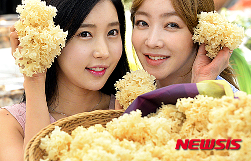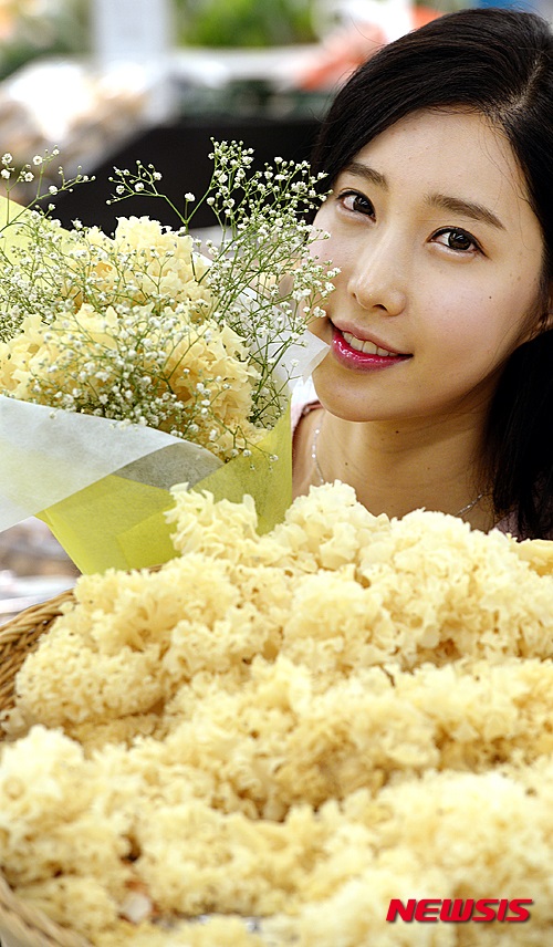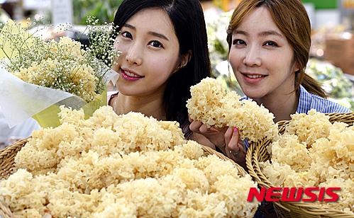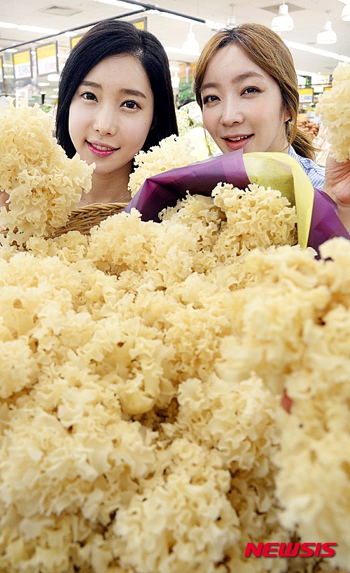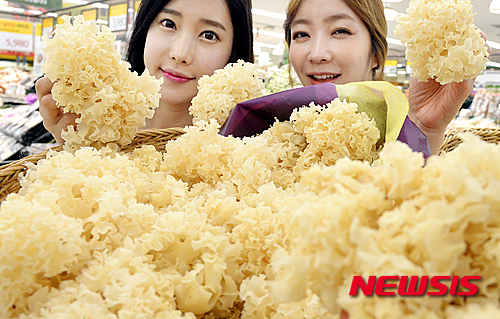 ソウル市内の大手スーパー「イーマート」竜山店で27日午後、モデルたちがハナビラタケを紹介した。