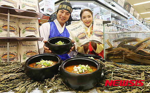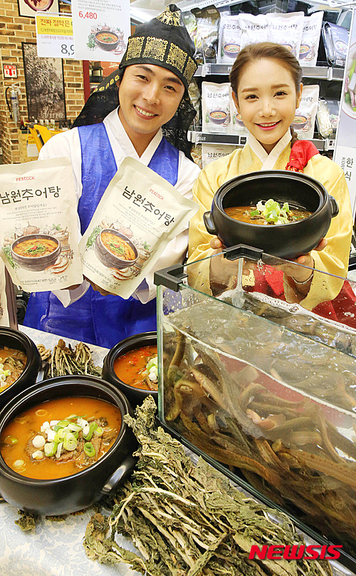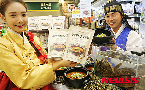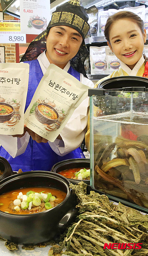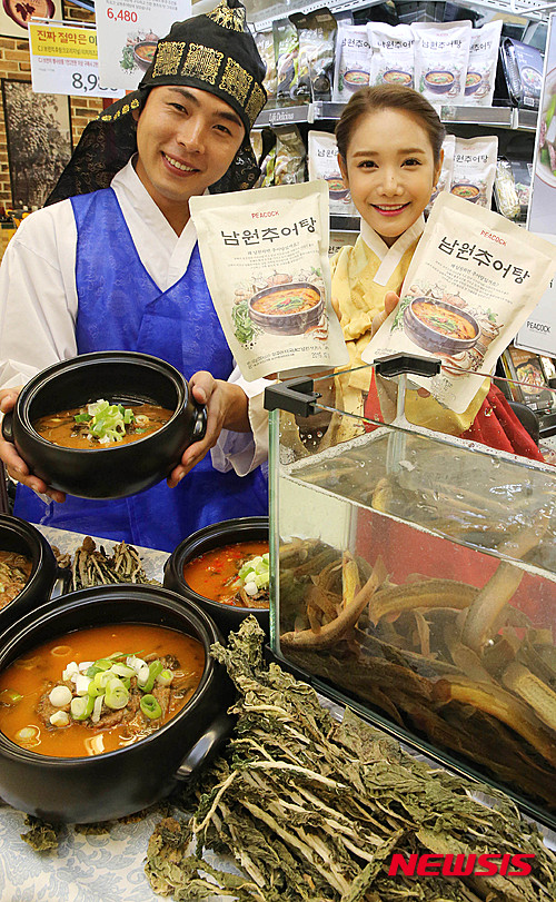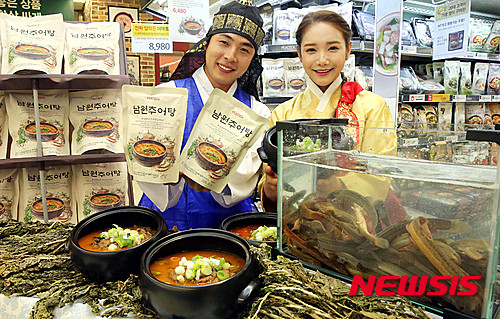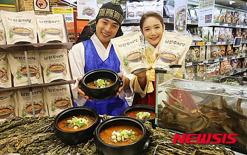 ソウル市内の大手スーパー「イーマート」竜山店で4日、モデルたちが、「国産の力プロジェクト」の一環でイーマートと全羅北道南原市が共同開発した「南原チュオタン(ドジョウ汁)」をPRした。