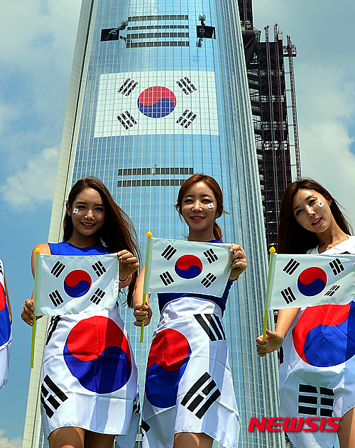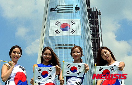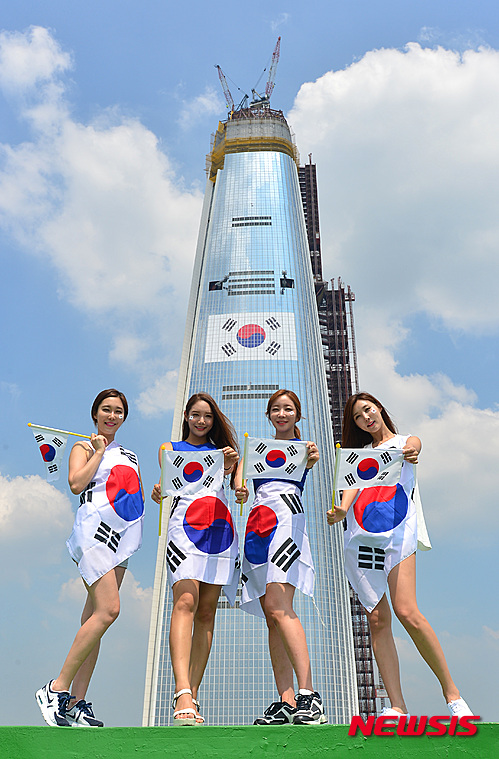 光復節(日本による植民地支配からの解放記念日、8月15日)を控えた6日午後、ソウル市松坡区のロッテホテルで、モデルたちがロッテワールドタワーの大型太極旗(韓国の国旗)を背景にポーズを取っている。