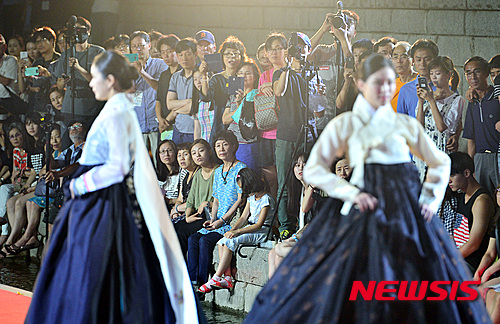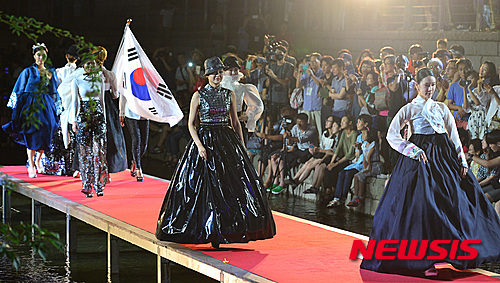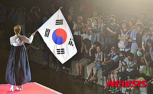 ソウル市内の東大門ファッションタウン近くに設置された清渓川水上ステージで8日夜、「光復70周年祝賀ファッションショー」が行われ、2015年ミスコリア選抜大会の入賞者たちが韓服(韓国の伝統衣装)デザイナー、モク・ウンジョンの服を着てランウェイを歩いた。