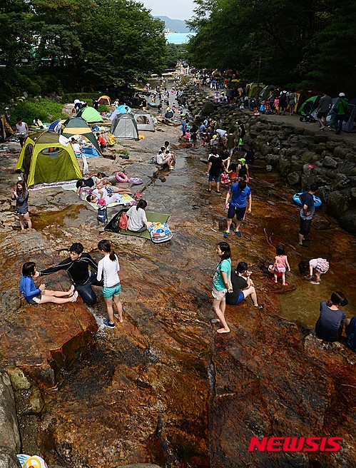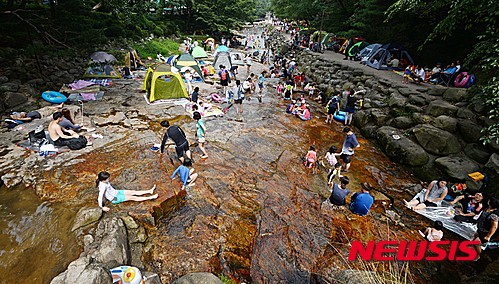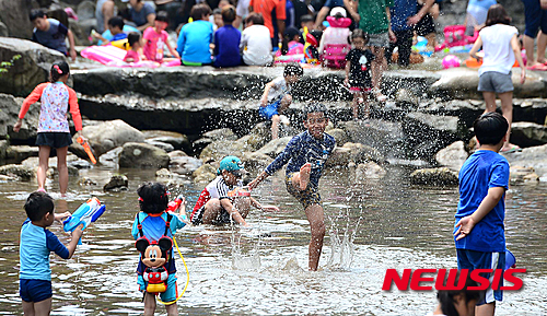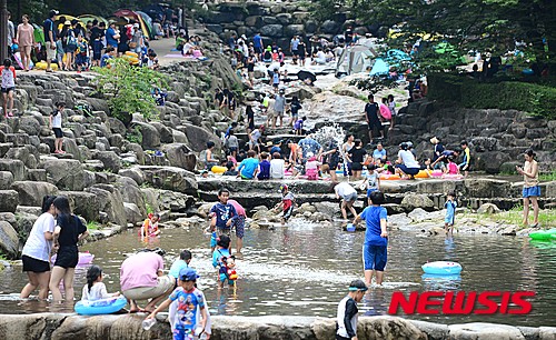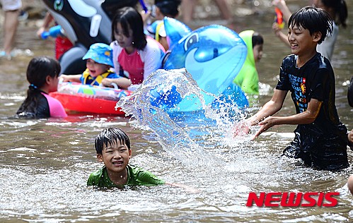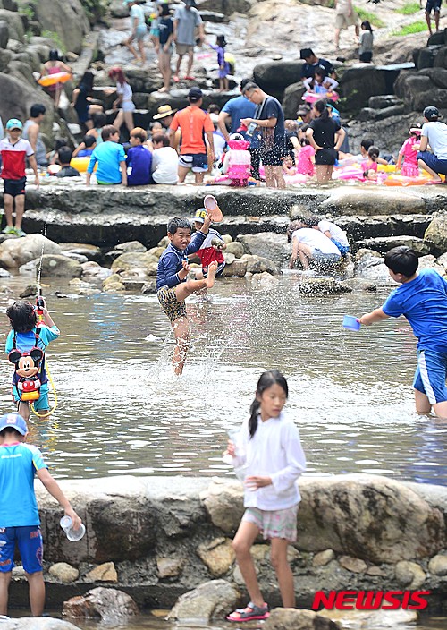ソウルをはじめ全国的に暑い一日となった9日、京畿道果川市の冠岳山のふもとにある渓谷を訪れた家族連れが、水遊びをしながら涼んでいた。