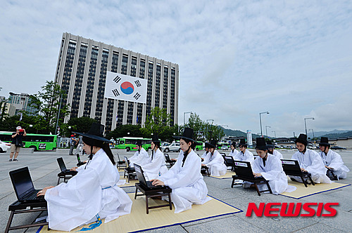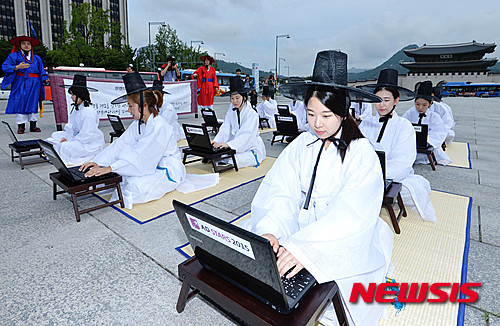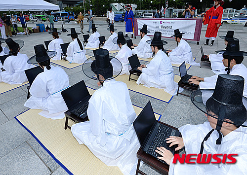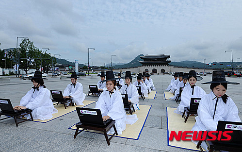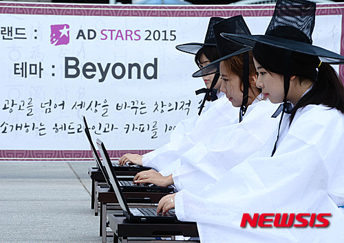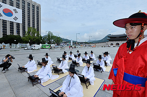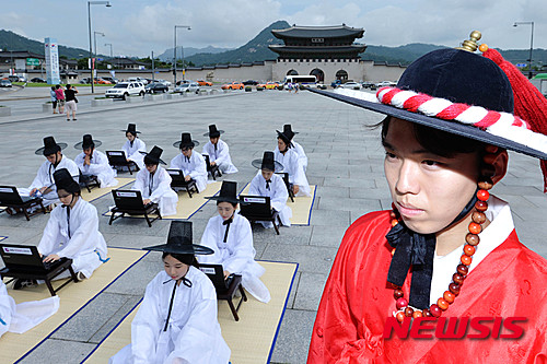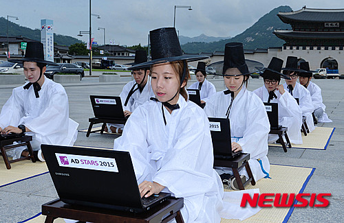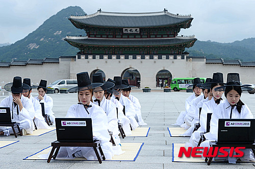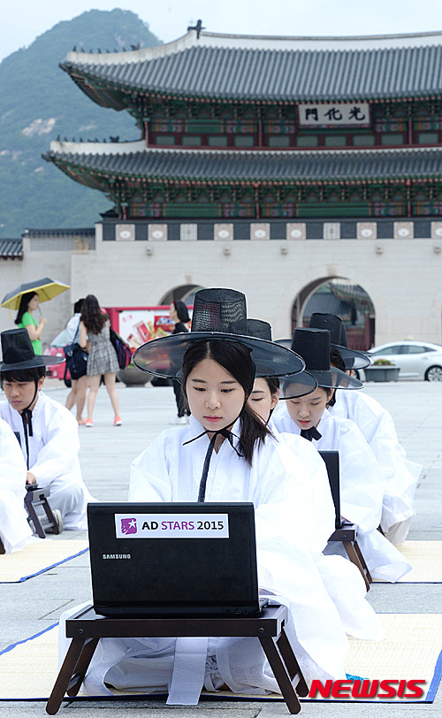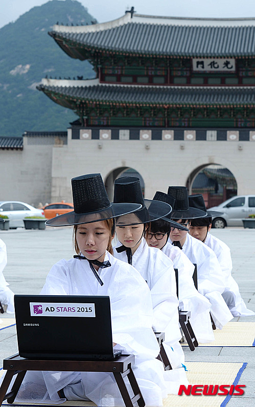 ソウル市鍾路区の光化門広場で10日午前、第8回釜山国際広告フェスティバル(8月20日開幕)を前に、斬新なコピーライターを発掘する「AD STARS 2015コピーライティング科挙試験イベント」が行われ、参加者たちが道袍(どうほう=朝鮮王朝時代の男性の礼服)に身を包み、朝鮮王朝時代の儒生になり切って科挙試験に臨んだ。