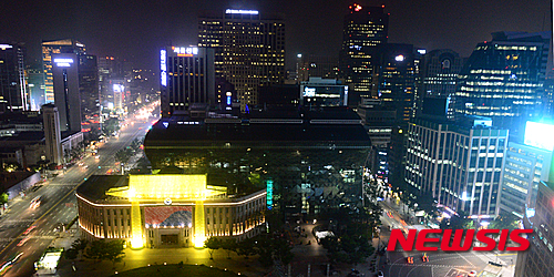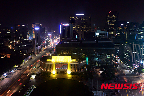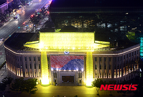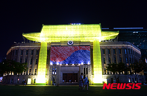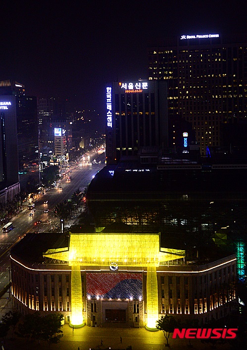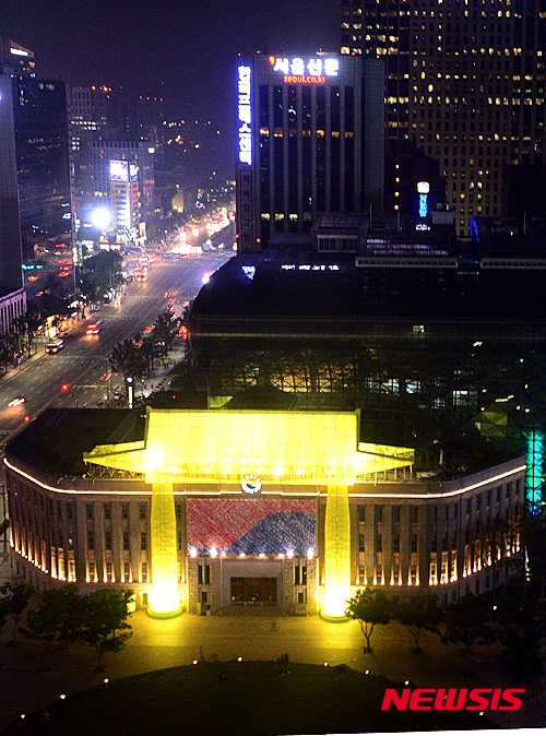 ソウル市中区のソウル広場を訪れた市民たちが10日夜、韓屋(韓国の伝統家屋)に変身したソウル図書館の夜景を眺めていた。