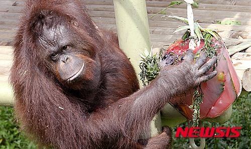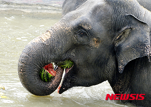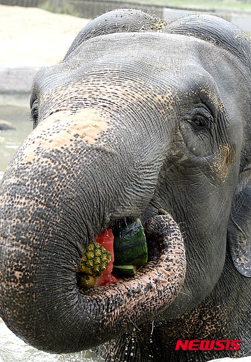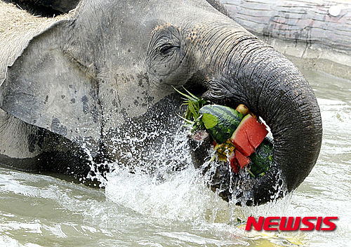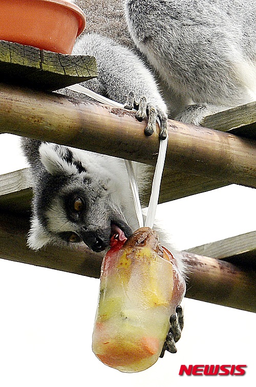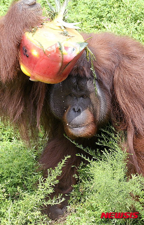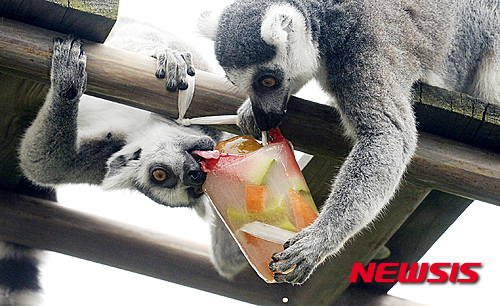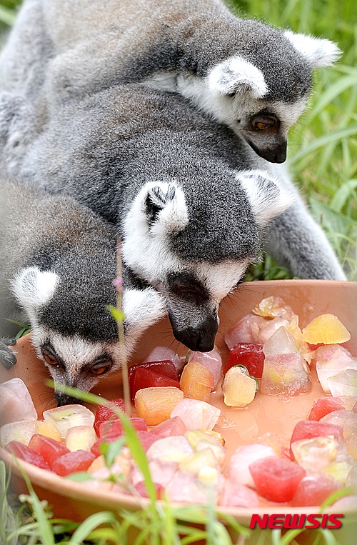 末伏(三伏の一つ、立秋後、最初の庚〈かのえ〉の日)を控えた11日午後、京畿道果川市のソウル大公園でゾウやキツネザル、オランウータンが冷凍フルーツを食べながら暑さをしのいでいた。