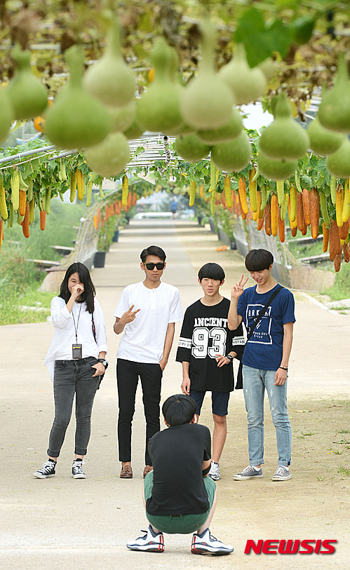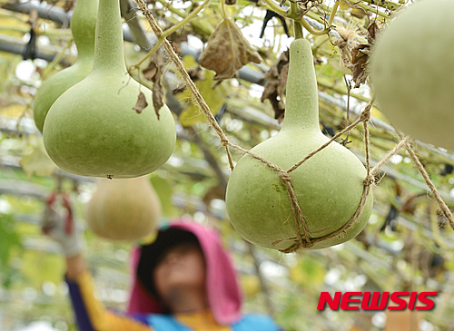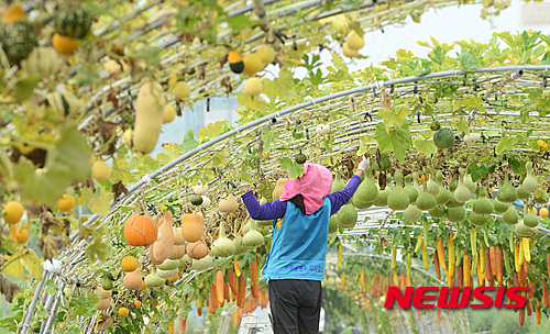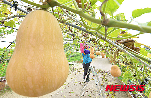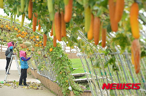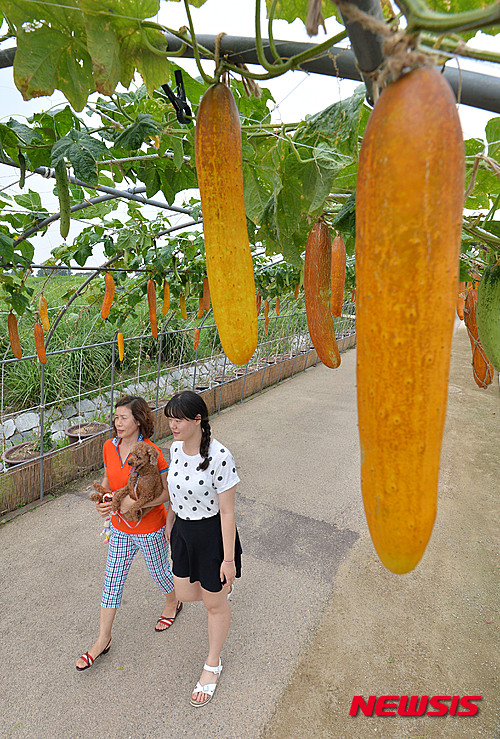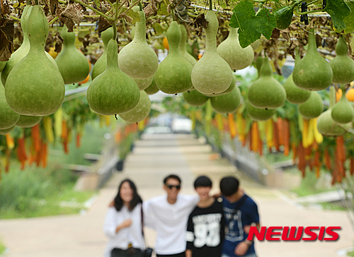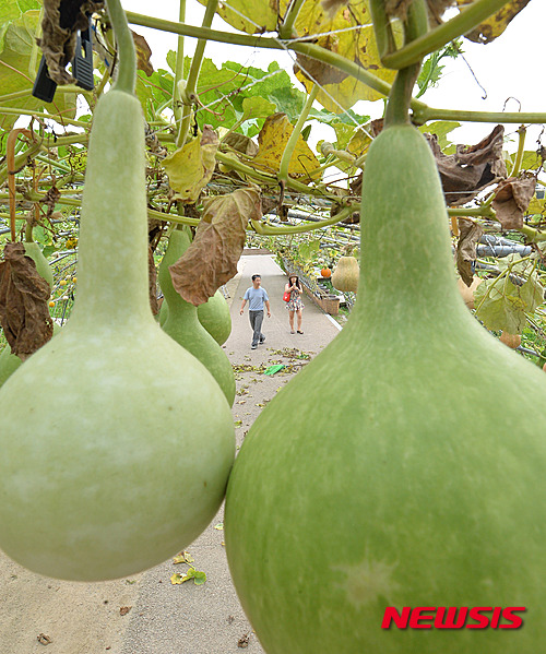 立秋が過ぎ、暑さが少しやわらいだ11日午後、ソウル市麻浦区のハヌル公園では、ヒョウタンやキュウリ、観賞用カボチャからなるトンネルで散歩を楽しむ市民たちの姿が見られた。