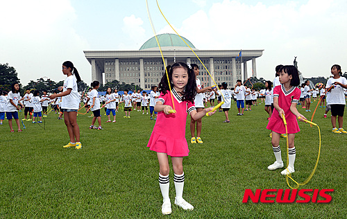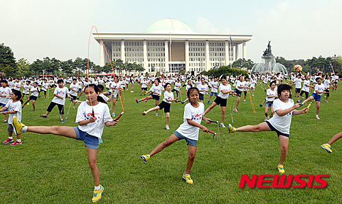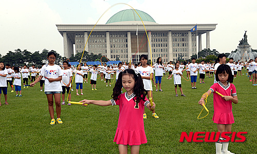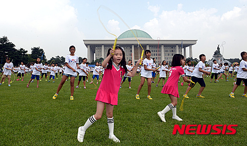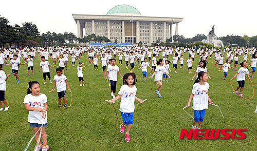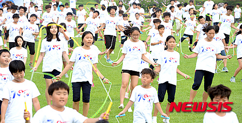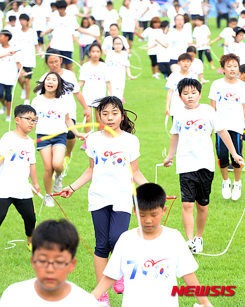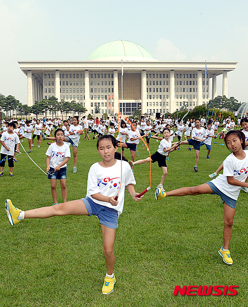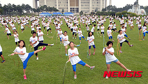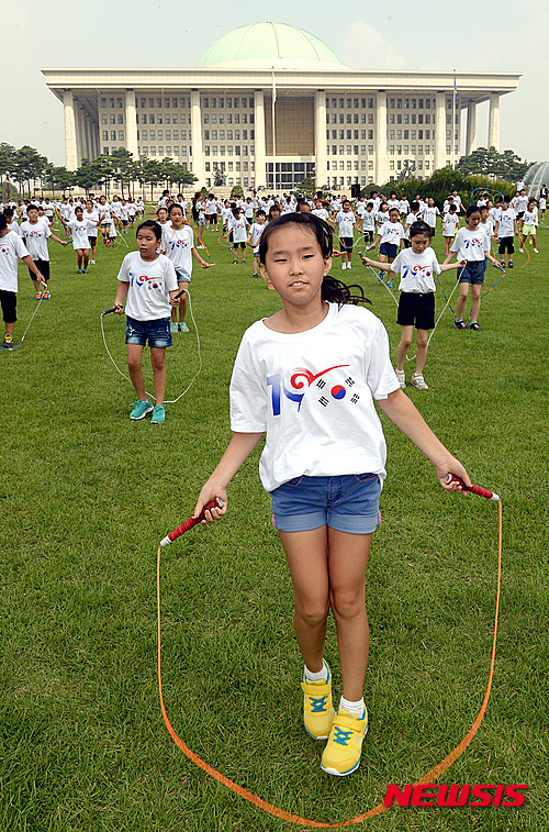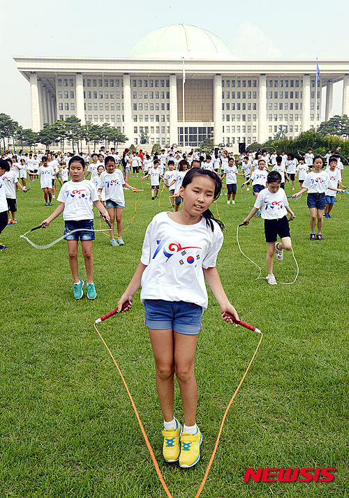 ソウル・汝矣島の国会前広場で13日午前、光復(日本による植民地支配からの解放)70周年を記念し、フラッシュモブ(不特定多数の人が特定の場所に集まり、同じ行動を取ること)が行われた。写真は、リズムに乗りながら縄跳びをする子どもたち。