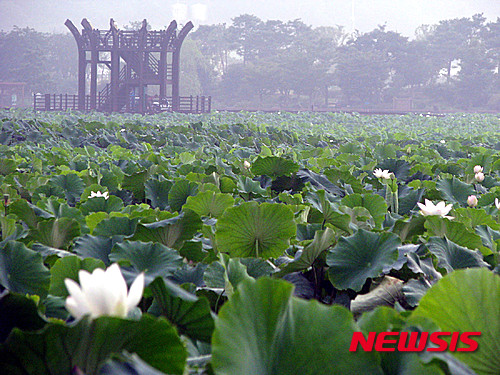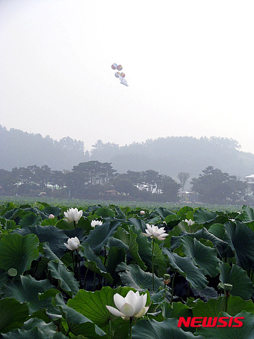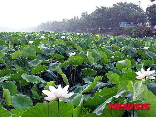 務安蓮祭り最終日の16日、全羅南道務安郡の回山白蓮池では、白い蓮の花が満開だった。同池は東洋最大規模の白蓮自生地で、面積は33万平方メートルに達する。