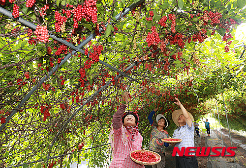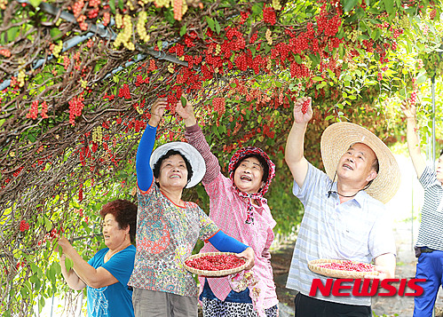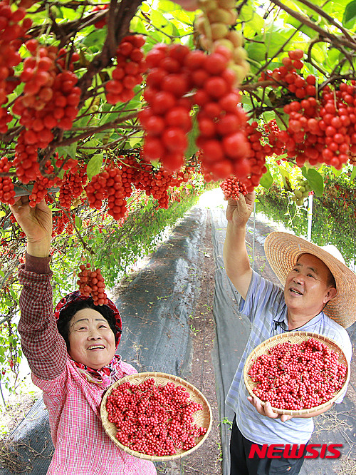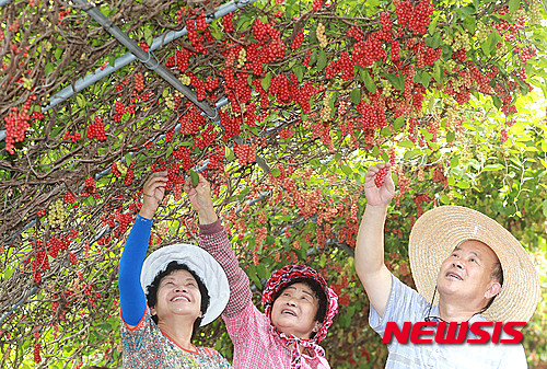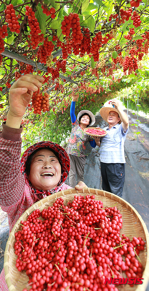 慶尚南道咸陽郡にあるチン・ギョンドさんのチョウセンゴミシ畑では17日、農民たちが赤く熟したチョウセンゴミシを収穫していた。