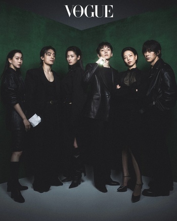ハン・ヒョジュはライトブルーのブラウスに黒のストレートパンツを合わせ、シックなイメージでまとめた。ブラウスはネックラインのひもをリボン結びにしてフェミニンな印象だ。