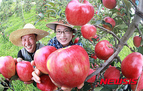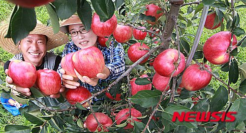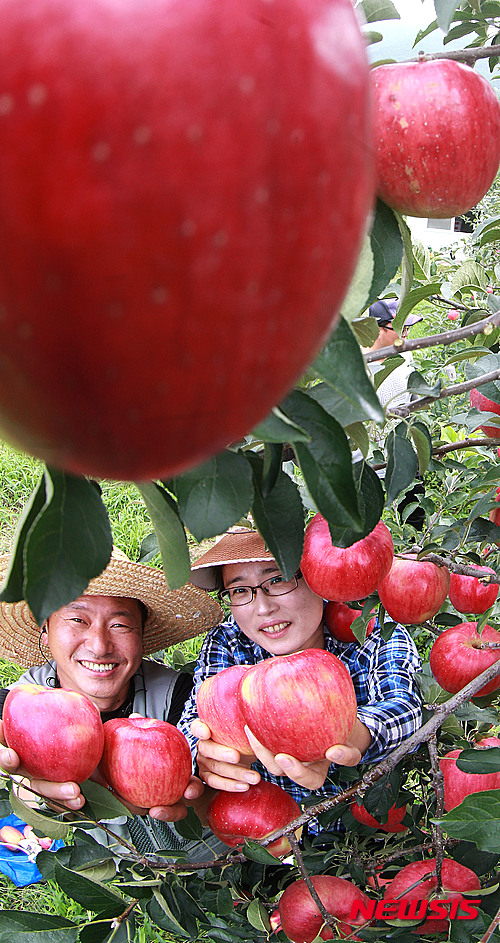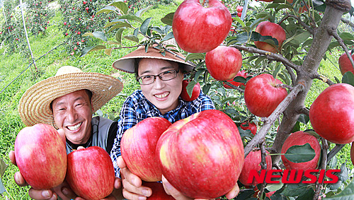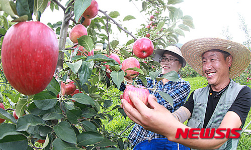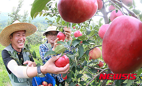 秋夕(チュソク=中秋節、今年は9月27日)をおよそ1カ月後に控え、慶尚南道咸陽郡にあるチョ・ギョンジェさんのリンゴ畑では24日、食べごろに熟したリンゴ「紅露」の収穫真っ盛りだった。