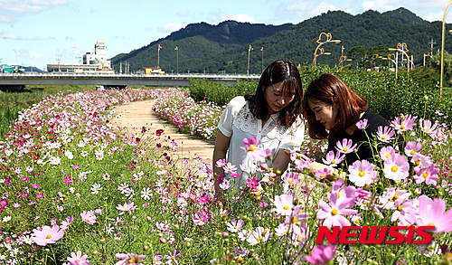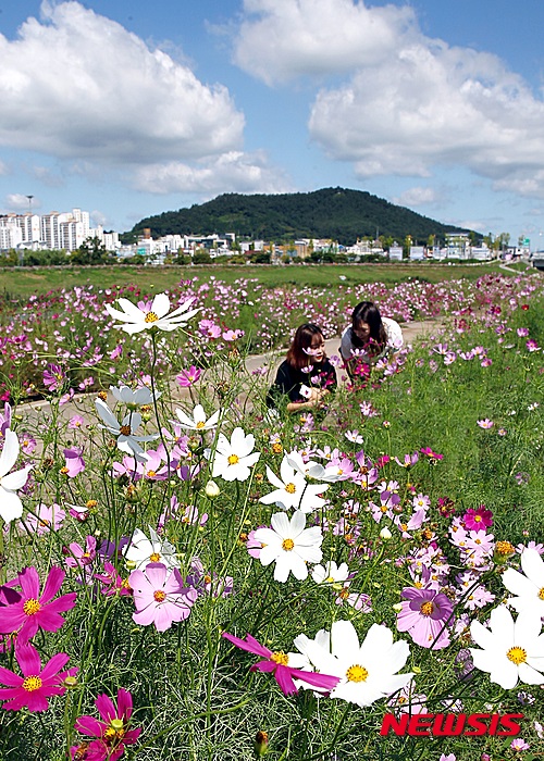 台風15号が去り、晴天となった26日午前、全羅南道咸平郡の川辺では、コスモスが見ごろを迎え、秋らしい雰囲気を漂わせていた。