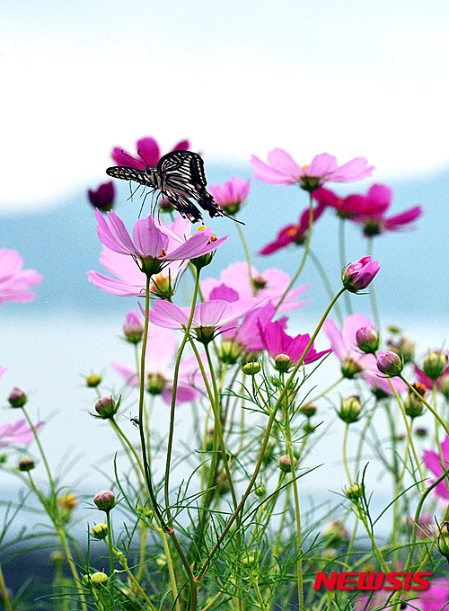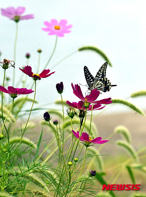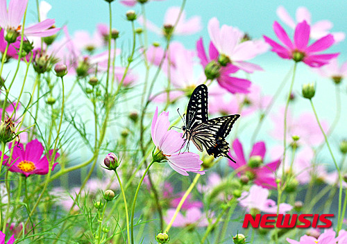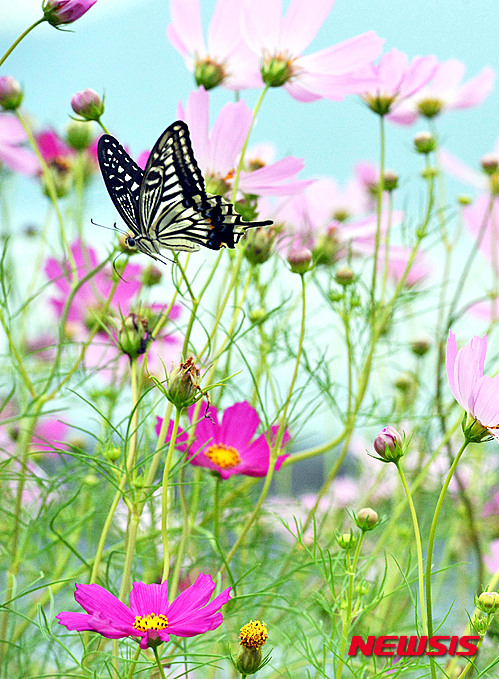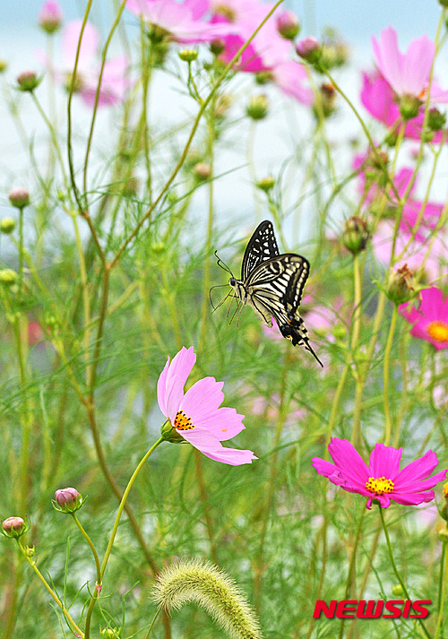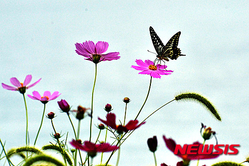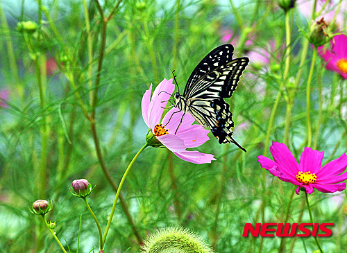 秋の訪れを感じさせる一日となった2日午前、慶尚南道南海郡では、アゲハチョウがコスモス畑を飛び回っていた。