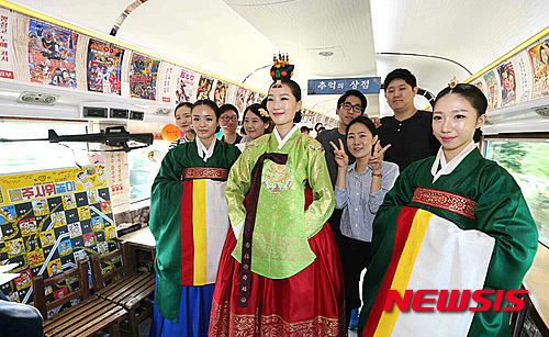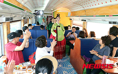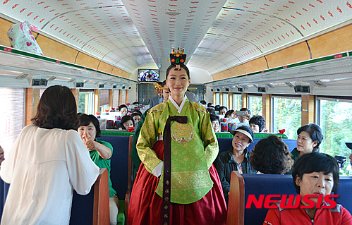 釜山駅を出発した南道海洋列車に乗車した国立釜山国楽院の「王妃の宴」公演団のメンバーが4日午前、王妃の衣装を身にまとい、各車両を回った。