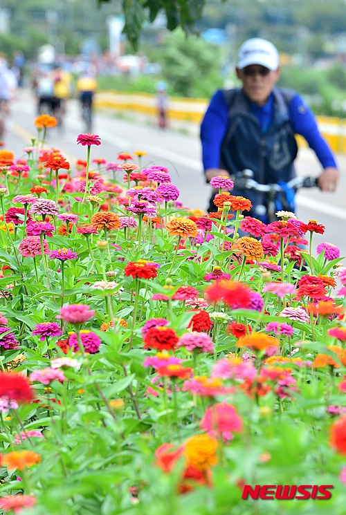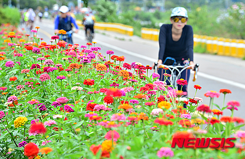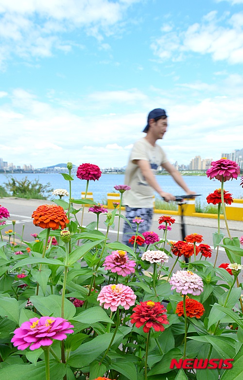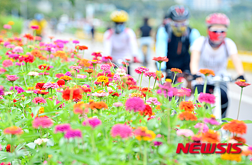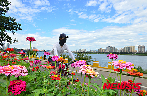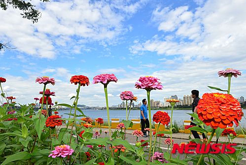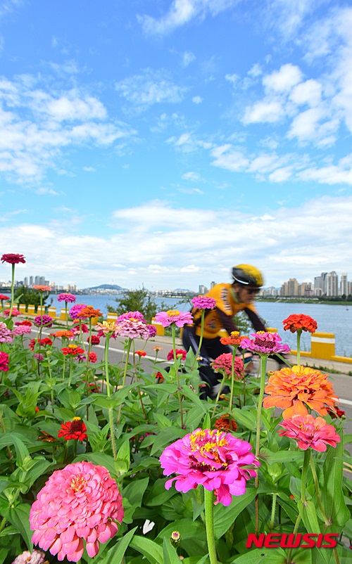 涼しい風が吹き、秋らしい陽気となった6日午前、ソウル市松坡区の蚕室漢江公園では百日草が見事に咲き誇っていた。