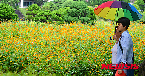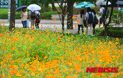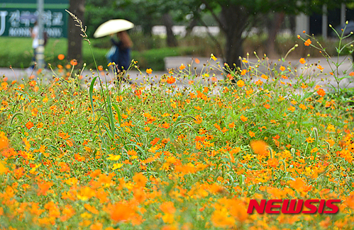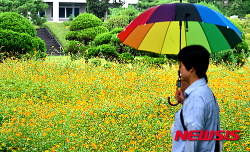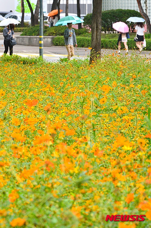秋雨が降った11日午後、建国大学(ソウル市広津区)のキバナコスモス畑のそばを、傘を手にした学生たちが通り過ぎている。